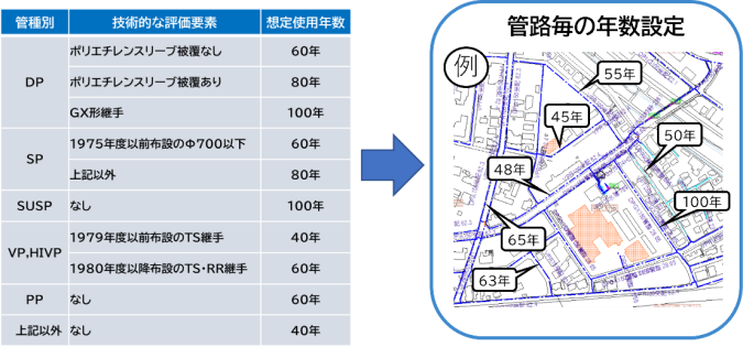 従来は想定使用年数を管種区分ごとに設定していましたが、AIを活用して算出した破損確率に基づき、また管種毎の技術特性を加味して管路1本毎に想定使用年数を設定しました。