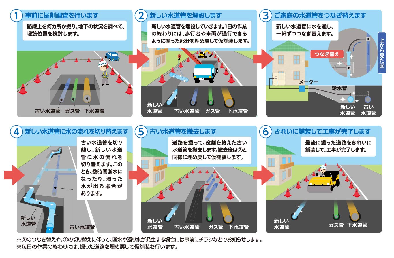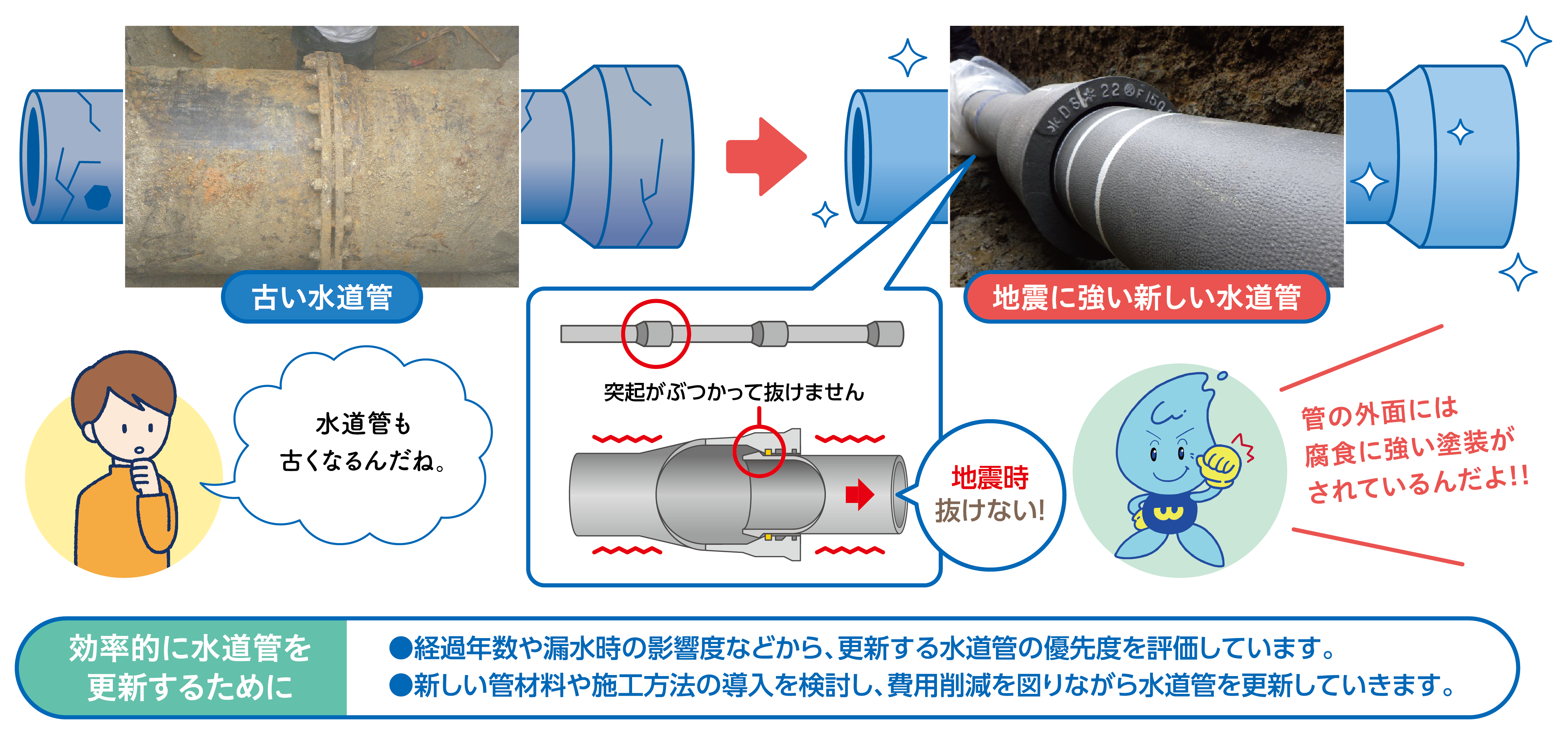 安心して水道水をご利用いただくために、古い水道管を新しい水道管に取り替える更新工事を計画的に進めています。 更新工事では、腐食に強く耐震性に優れた水道管を使用しています。